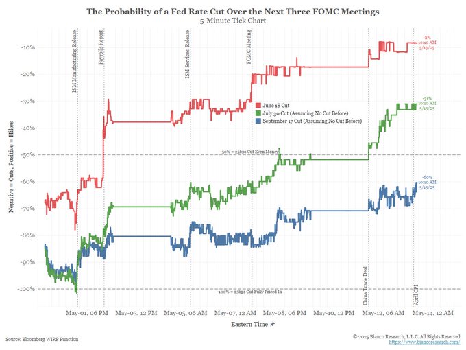 值得一提的是,Bianco在帖子中附带的一张图表确实显示,本月以来,从ISM制造业PMI、非农、ISM服务业PMI、美联储决议发布,到昨夜最新的美国4月CPI数据,美联储降息预期在每个“大日子”里几乎都有所削弱……