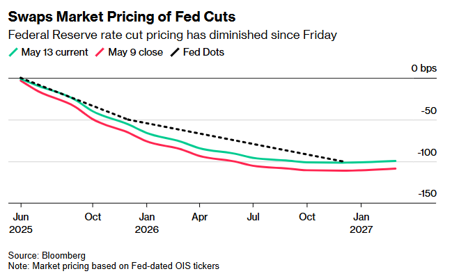这倒并不是说每组数据都不利于降息前景,例如昨日低于预期的美国4月CPI数据,本身理应有利于美联储尽早降息,但颇为反常的是,即便是特朗普拿着数据对美联储主席鲍威尔“蹬鼻子上脸”,但降息预期依然还在减弱: